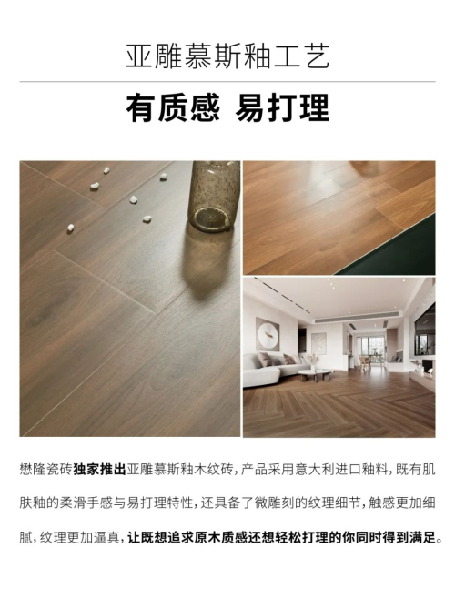 懋隆瓷磚成立于2008年,總部位于廣東佛山陶瓷總部基地,一直專注于高端木紋磚的生產與研發。于2008年首推原邊木紋磚,2013年首推1.8米大規格木紋條,風靡業界。公司木紋磚品類豐富,規格齊全,工藝領先,是目前國內專業的木紋磚生產和銷售企業。